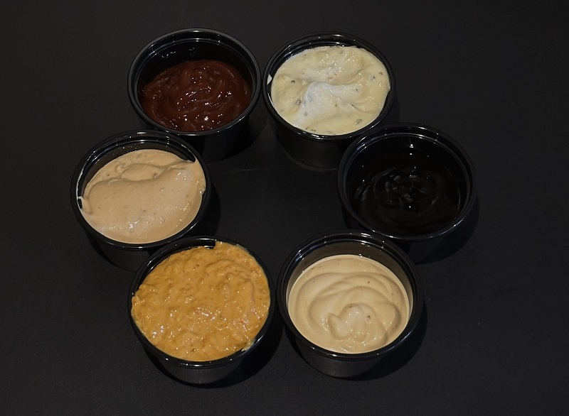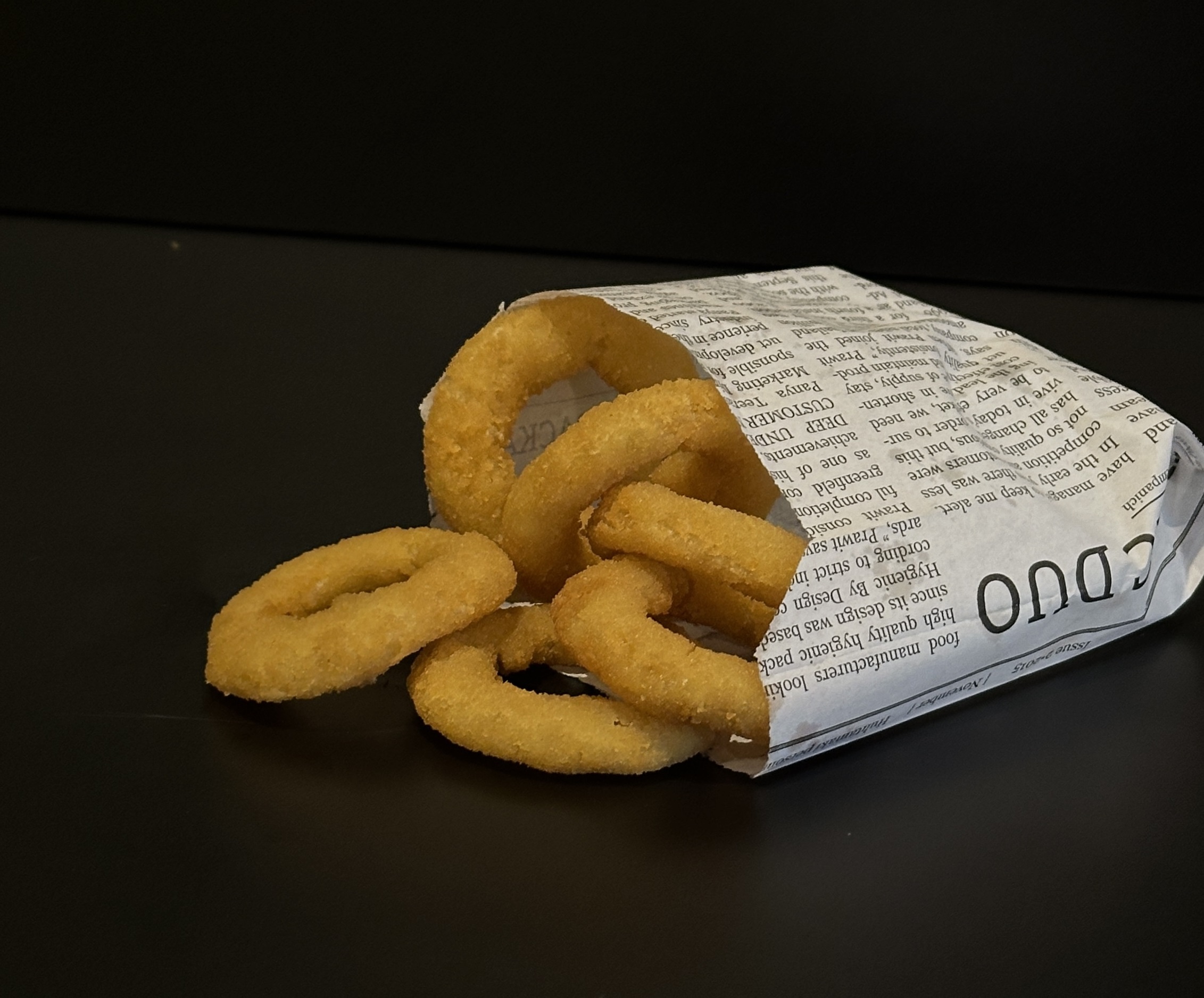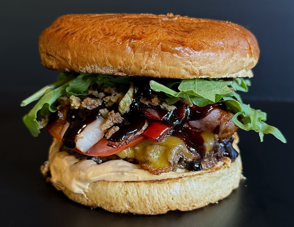 BUŁKA, 200G WOŁOWINY, CHEDDAR, CEBULA KARMELIZOWANA, 2X BEKON, POMIDOR, PAPRYKA GRILLOWANA, RUKOLA, CEBULKA PRAŻONA, SOS BBQ